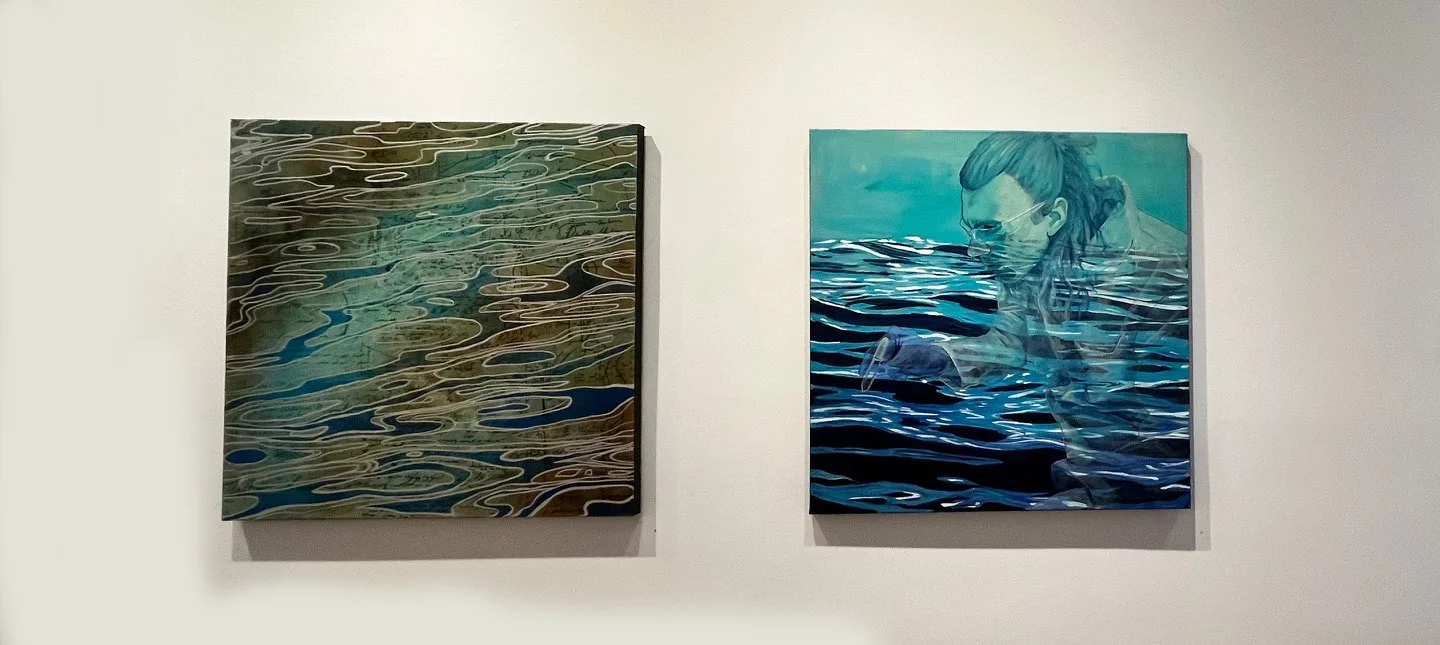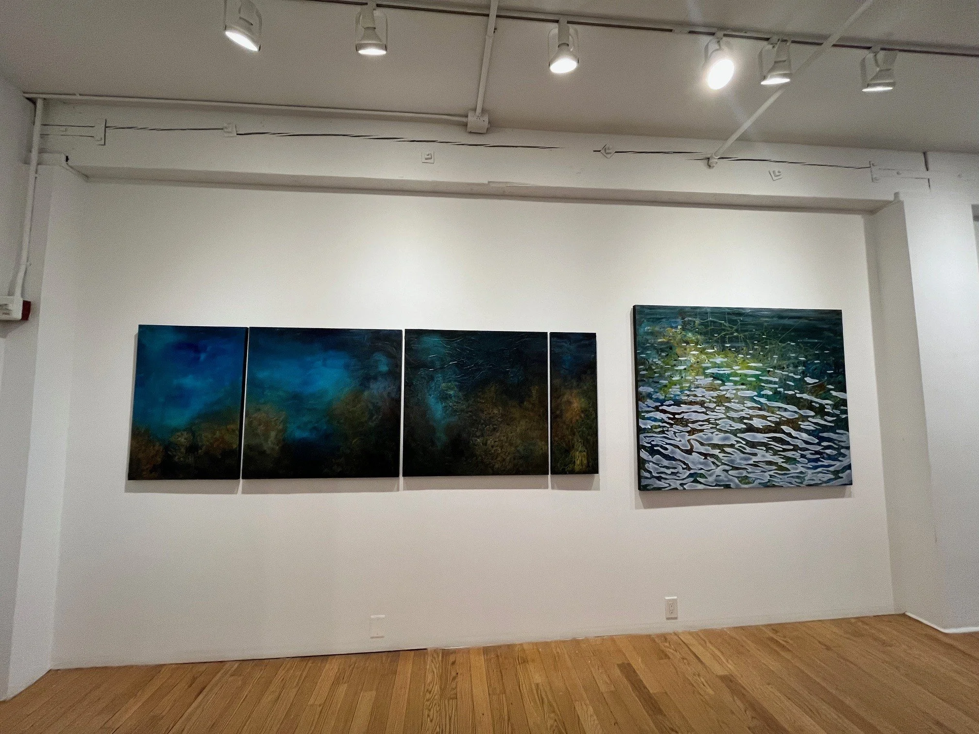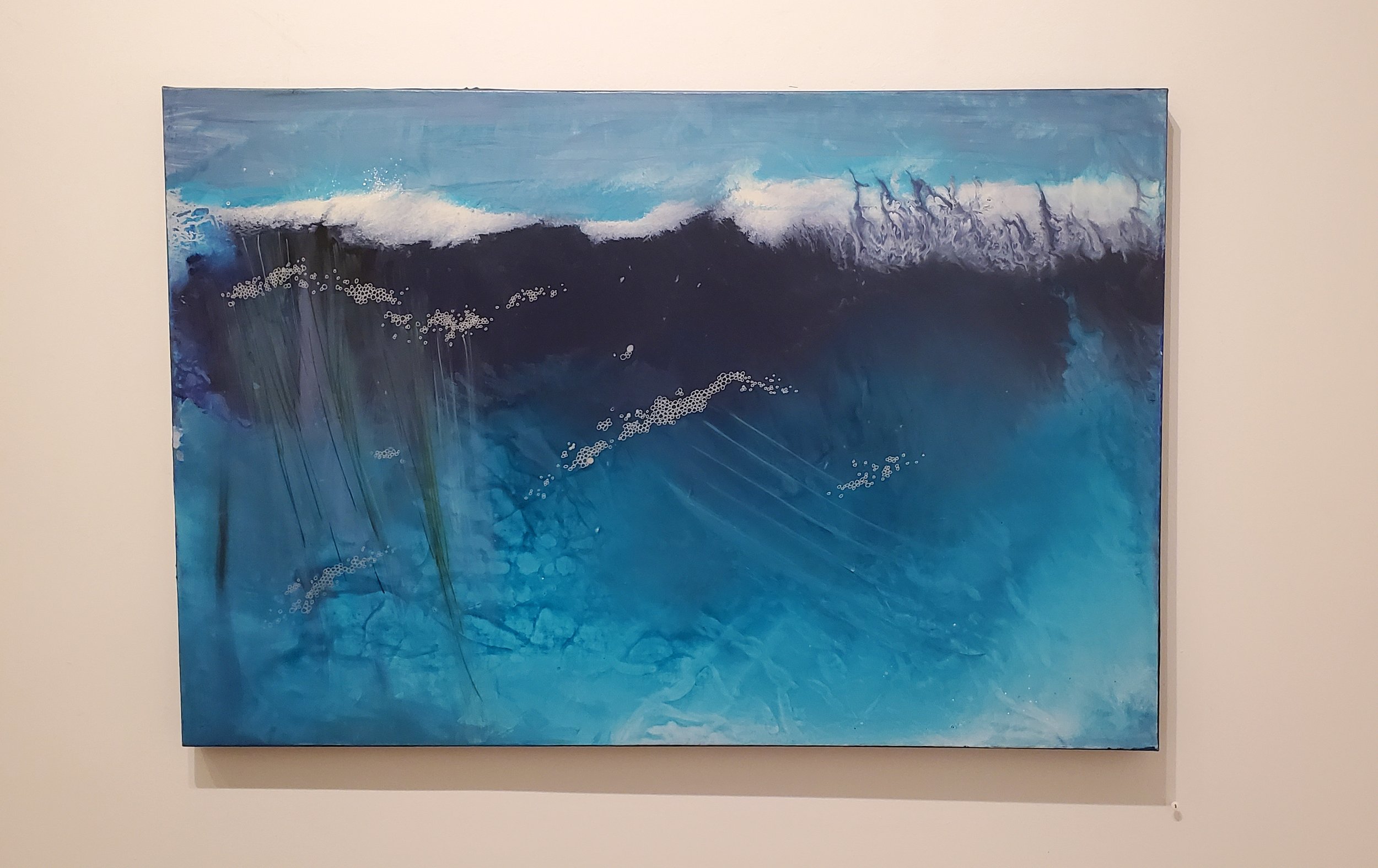 The exhibition includes a massive 110-inch quadriptych that explores the sense of weightlessness and mystery that she finds in the imagining unknown ocean depths. Other paintings explore surface water patterns as abstract design.