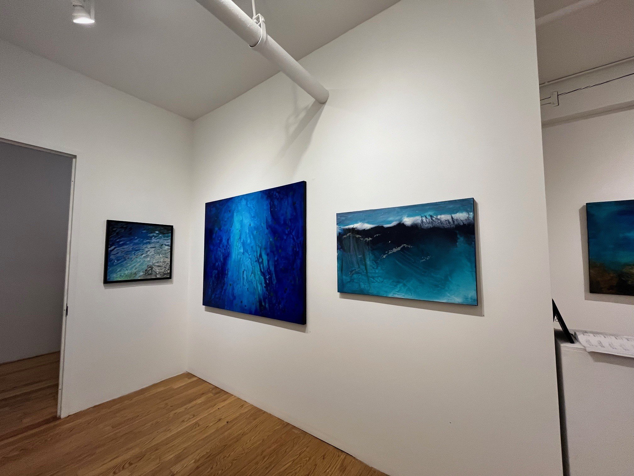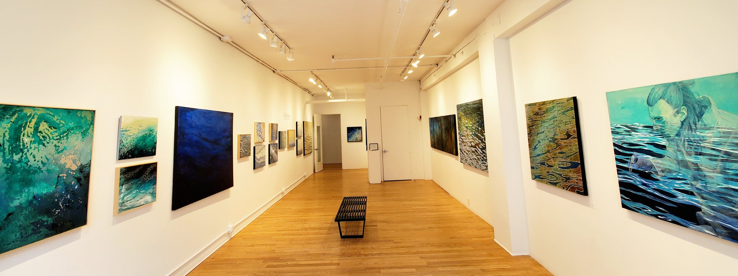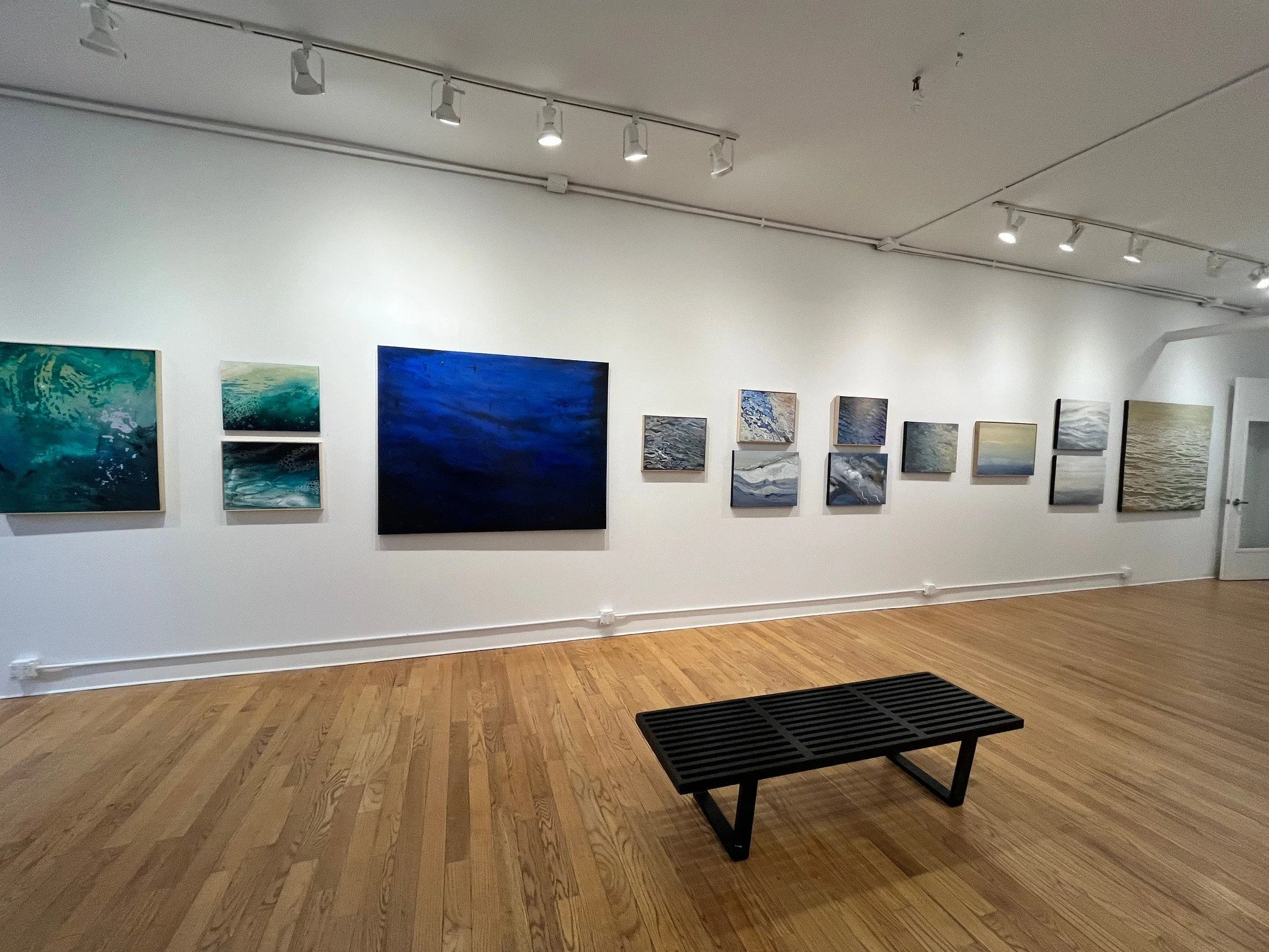 The exhibition includes a massive 110-inch quadriptych that explores the sense of weightlessness and mystery that she finds in the imagining unknown ocean depths. Other paintings explore surface water patterns as abstract design.